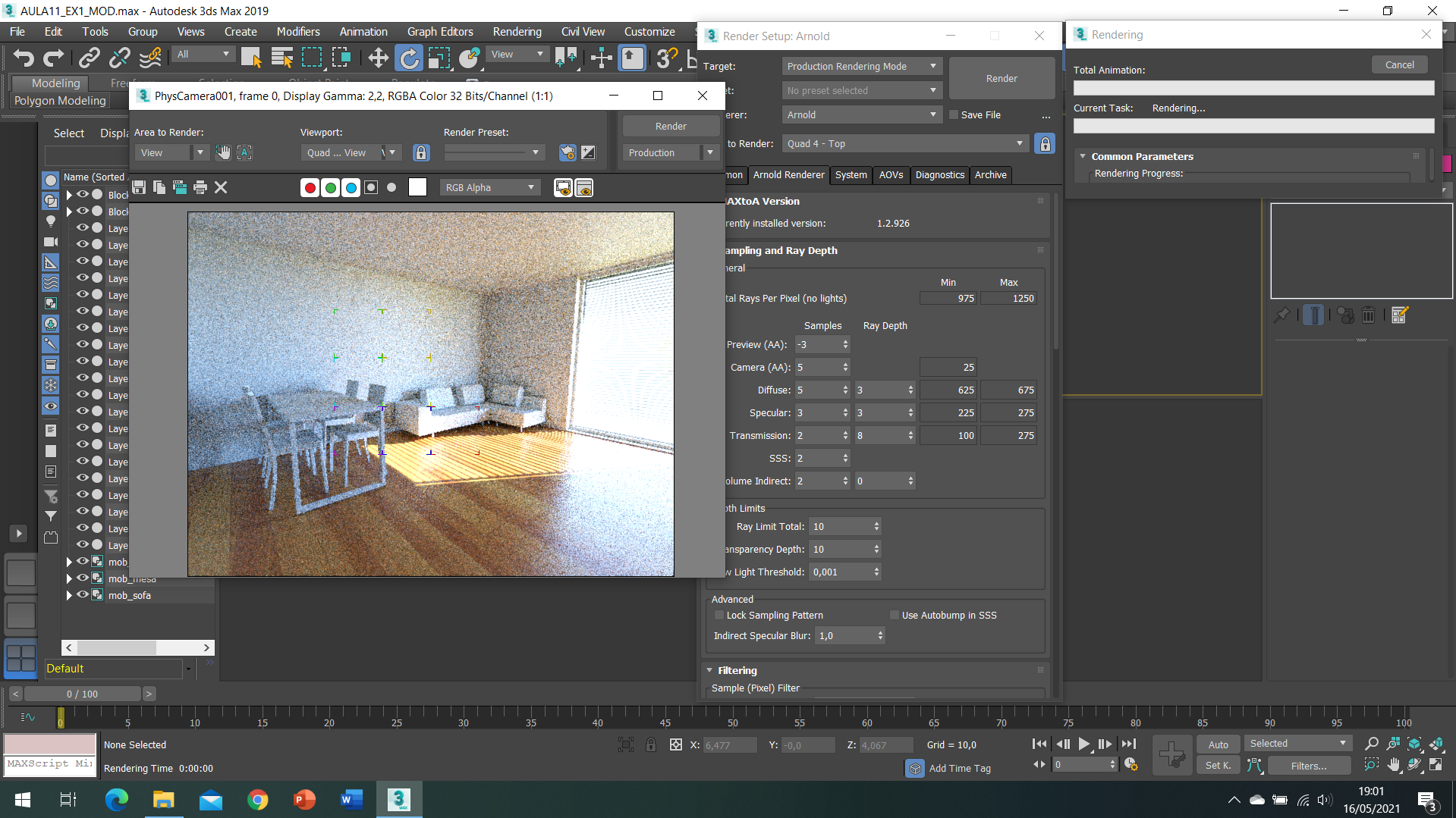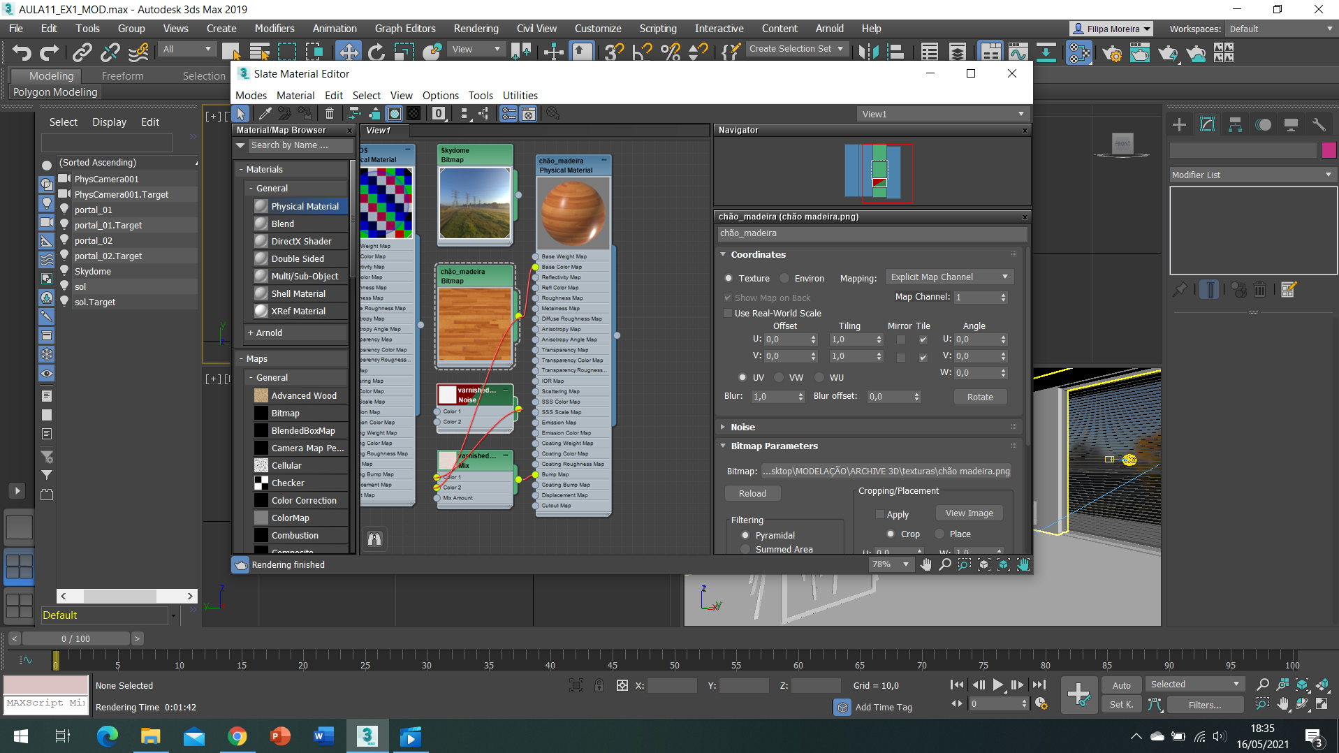 - Colocação de madeira no chão da sala, da qual inicialmente temos de ir à internet pesquisar "free wood pavements textures" (devo escolher uma imagem clara, porque quando é escura, absorve mais a luz). De seguida clicar no Material Editor » Bitmap » selecionar a imagem guardada. Criar uma physical material para ligar ao Bitmap » ligar a madeira que fomos buscar ao novo physical material » Assign Material to Selection.